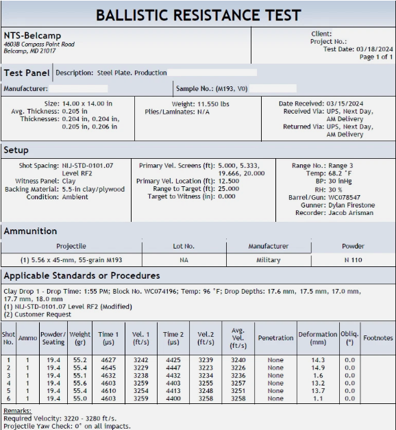 Stops 12% higher velocity impacts (2900 → 3250 fps) than our previous CATI500 1/4" AR500 plate, while being 20% lighter — resulting in a 40% increase in ballistic strength per pound carried.